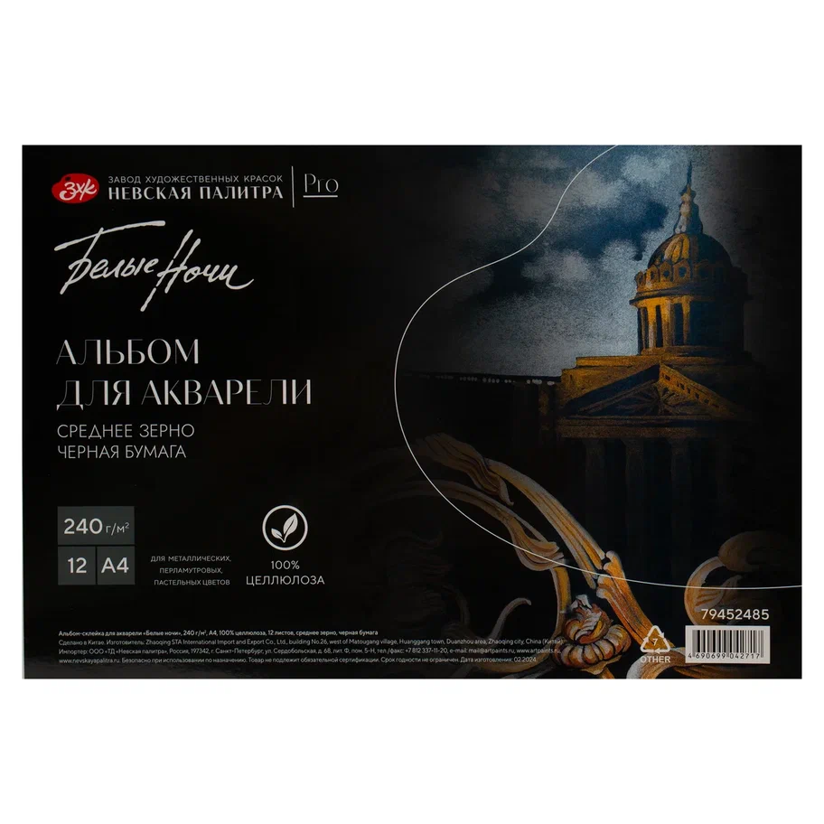 Альбом-склейка для акварели "Белые ночи" А4 12 л 240 г, 100% целлюлоза, среднее зерно, черная бумага