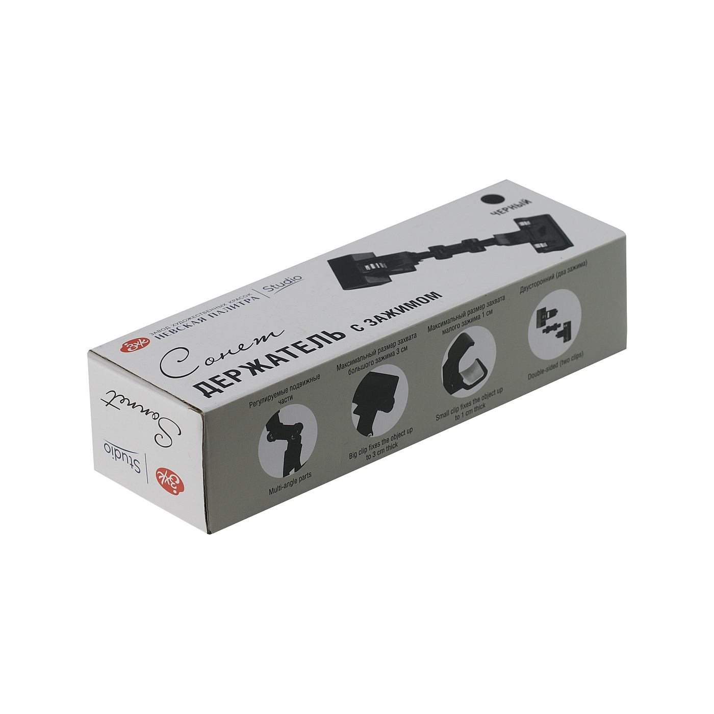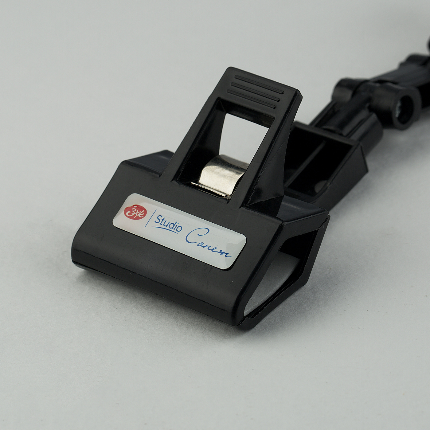 Держатель с зажимом предназначен для фиксирования иллюстрации, фотографии, эскиза для работы. Также может использоваться для демонстрации готовых работ на холстах на картоне и МДФ. Держатель удобен в работе благодаря возможности вращения зажимов на 360° и регулировке угла наклона подвижных частей. Один зажим держателя крепится к планшету или мольберту толщиной до 3 см, второй фиксирует предмет толщиной до 1 см. Держатель можно разбирать. Незаменимый инструмент художника, архитектора, дизайнера, инженера. Удобен при работе не только в студии, но и на пленэре. Размер: 5,3x18,5 см.