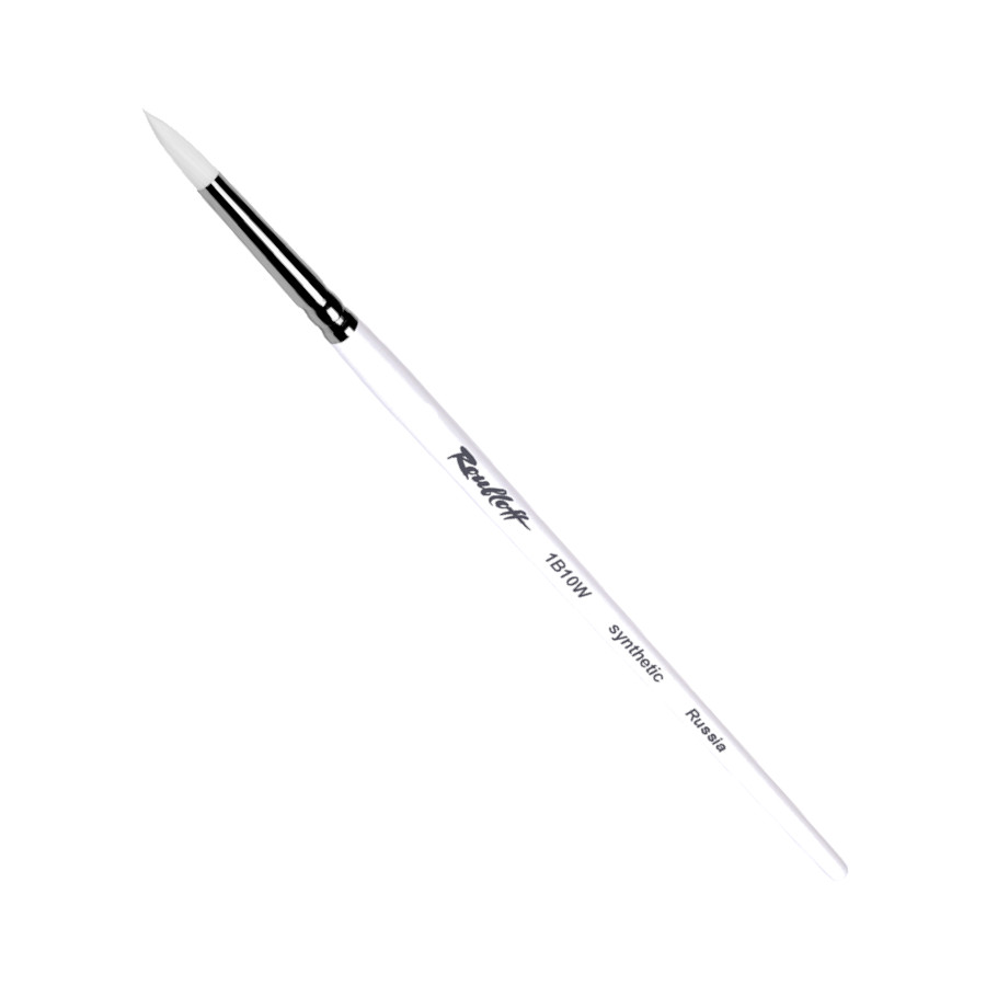 Круглая кисть из белого синтетического ворса является отличным инструментом для множества типов живописных работ. Форма пучка в виде конуса с идеальным зауженным кончиком позволяет писать крупными, плотными мазками, а также вести тонкую и изящную линию. Короткая глянцевая ручка, окольцованная хромированной медной обоймой, даёт возможность лучше контролировать работу кисти. Белый цвет волоса позволяет более точно отслеживать чистоту оттенка краски, что увеличивает качество работы с точки зрения колористики, а новый подход к технологии создания синтетики увеличил эластичность и упругость материала.