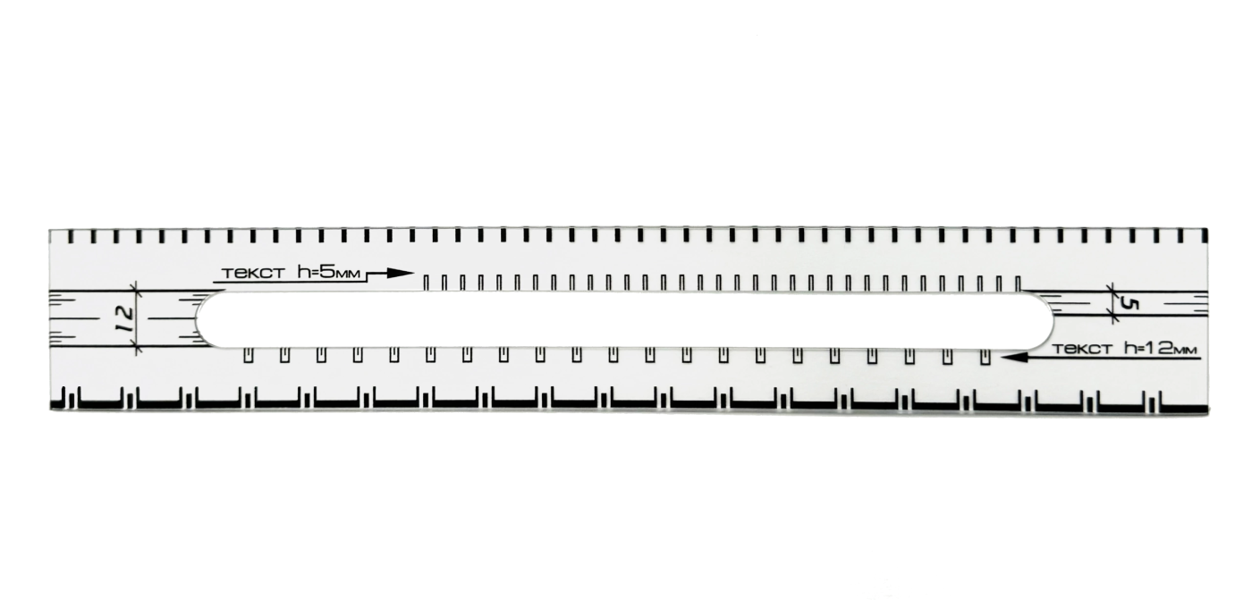 • Данная линейка позволяет быстро и аккуратного чертить узкий архитектурный шрифт 12 мм. (для заголовков), 5 мм. (для подписей).