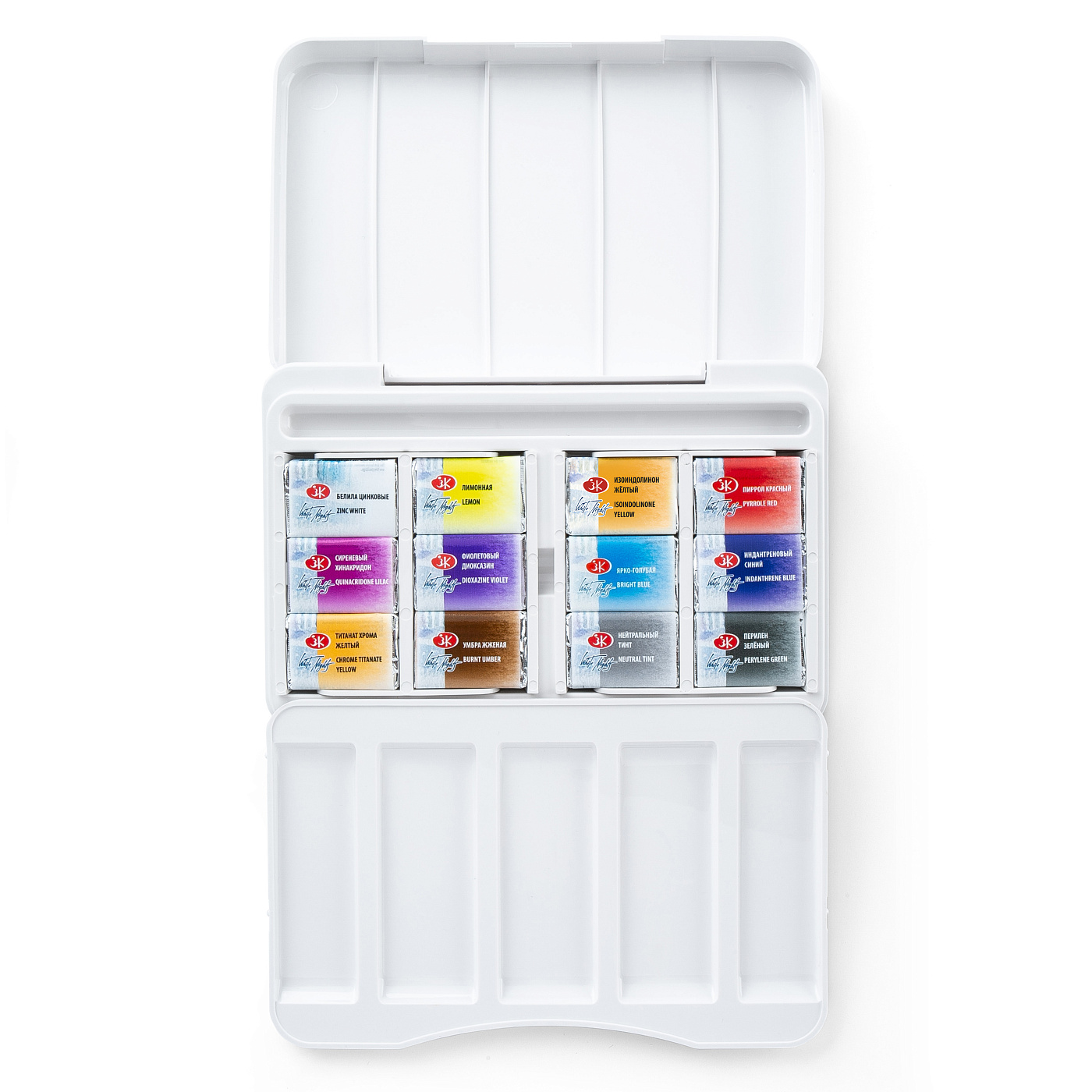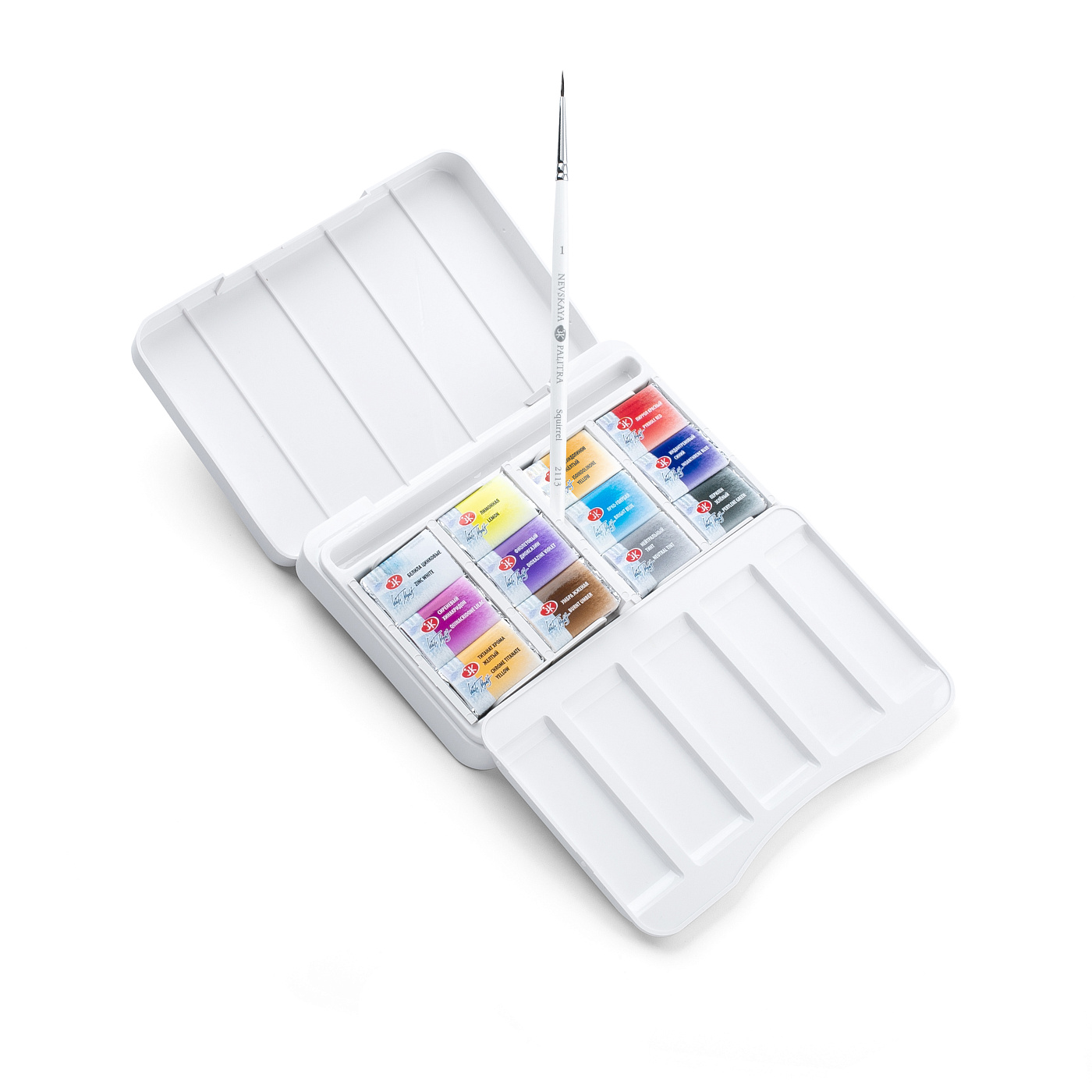 Набор комплектуется в компактный пластиковый пенал со съемной палитрой и отделением для дорожной кисти. Съемные кассеты для кювет облегчают уход за пеналом. Кюветы объемом 2,5мл.