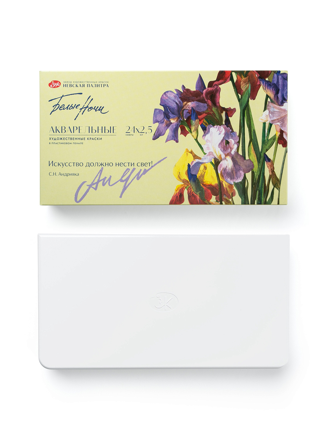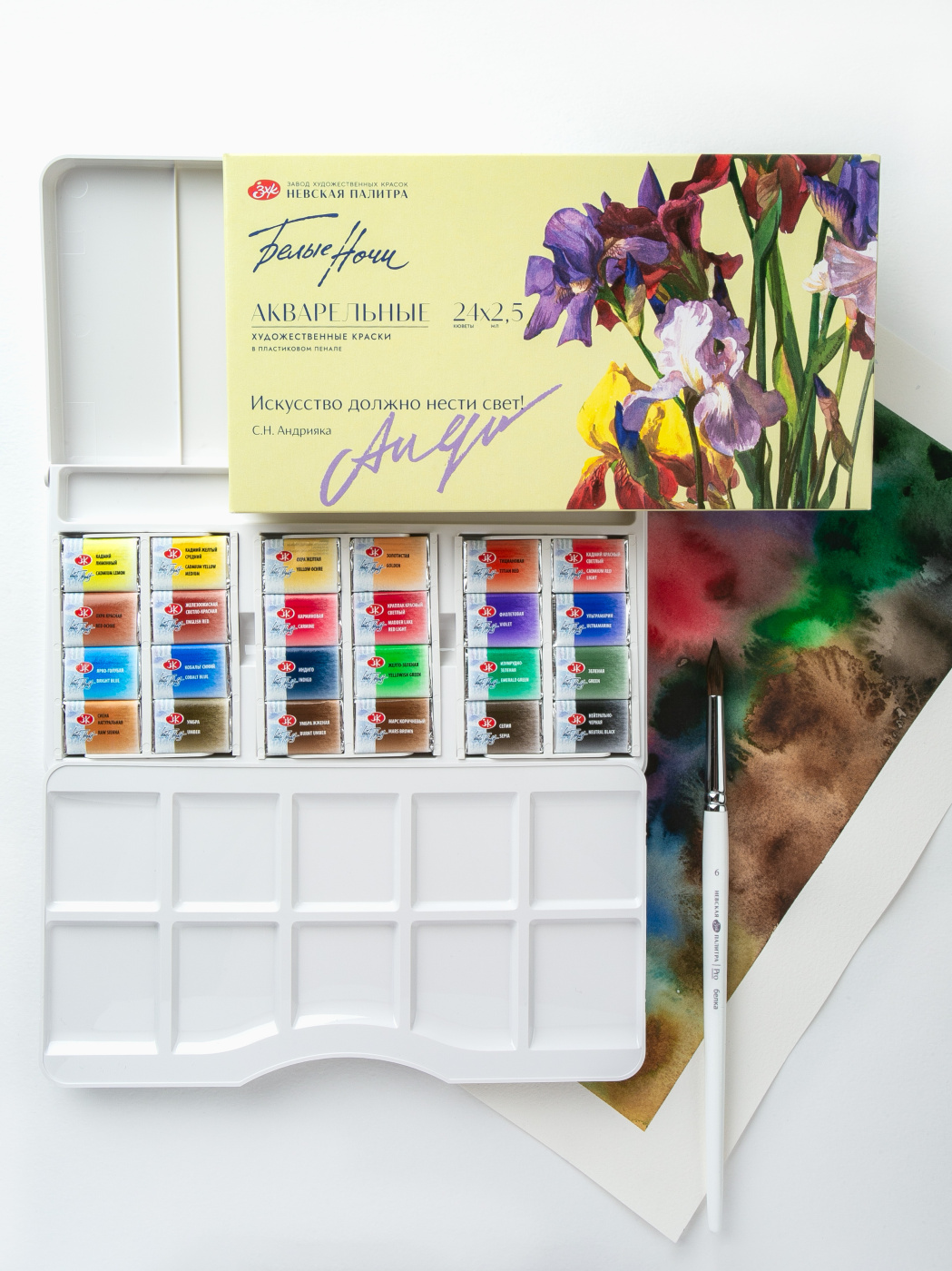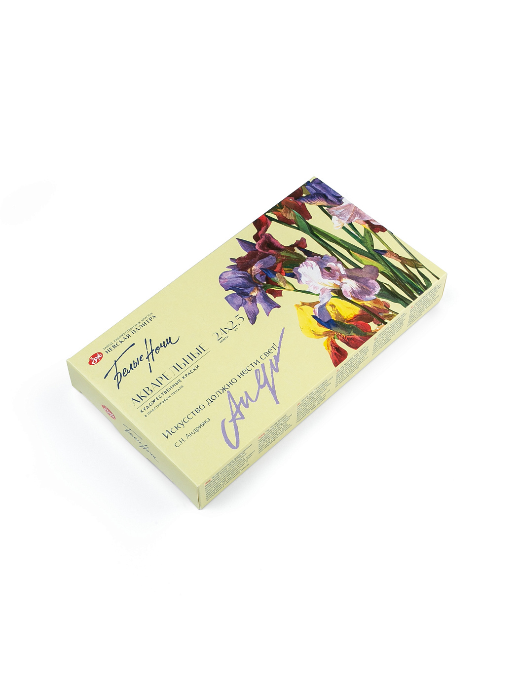 Набор акварельных красок «Белые ночи» «Искусство должно нести свет» посвящён памяти выдающегося мастера — Сергея Николаевича Андрияки, художника, педагога, вдохновителя школы живописи. Его талант и светлая философия творчества продолжают жить в работах учеников, в любви к прозрачности цвета и чистоте акварельного тона. Каждая кювета этого набора — как напоминание о бережной передаче традиций, о стремлении художника к гармонии, красоте и свету, который, по словам мастера, искусство обязано дарить миру.