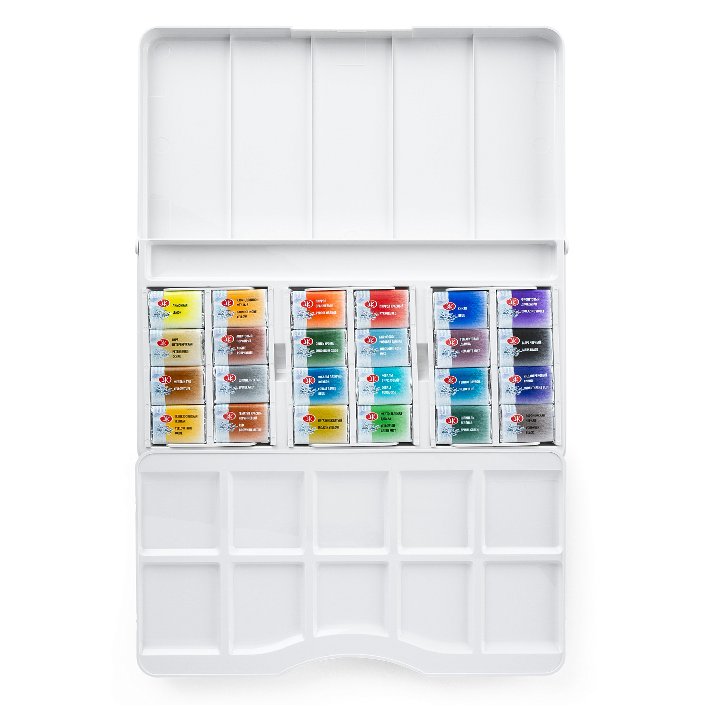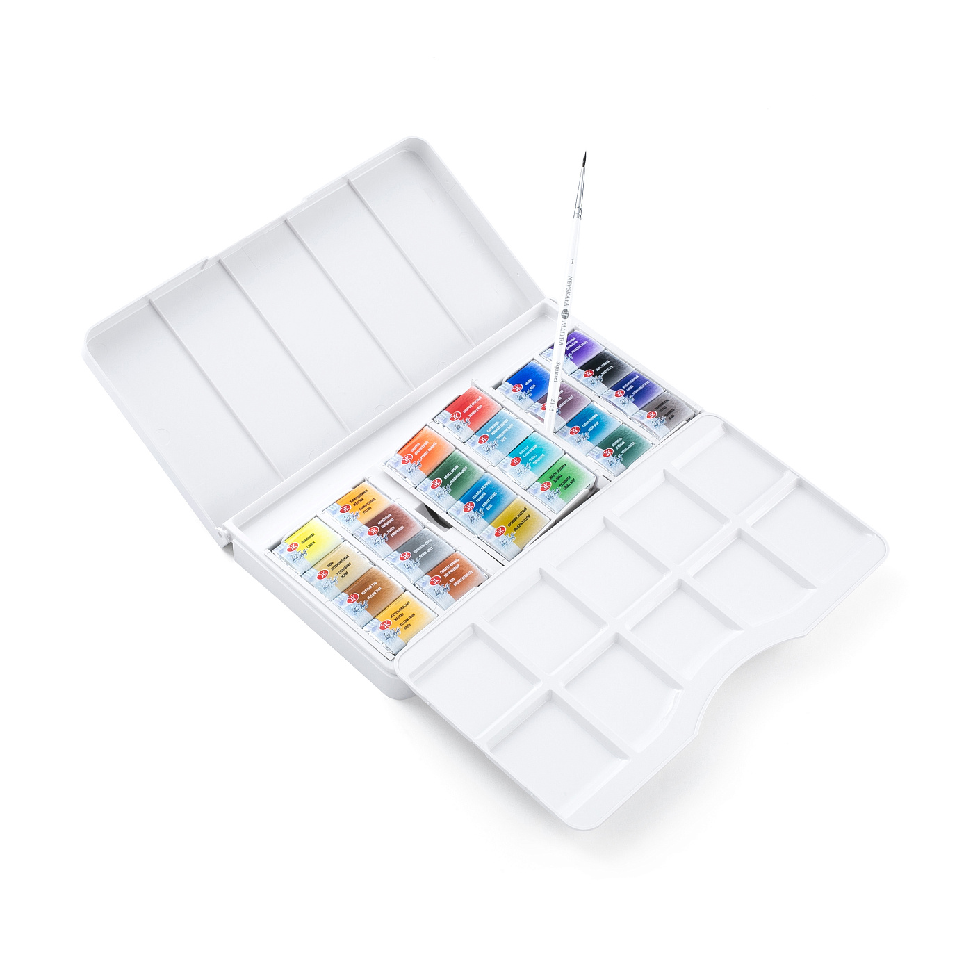 Набор комплектуется в удобный пластиковый пенал со съемной палитрой и отделением для дорожной кисти. Съемные кассеты для кювет облегчают уход за пеналом. Кюветы объемом 2,5 мл.