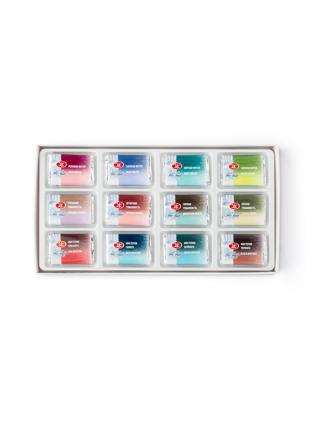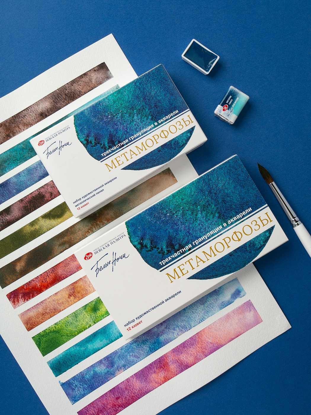 Набор акварели «Метаморфозы» - это коллекция из 12 оттенков трехчастной грануляции в акварели.