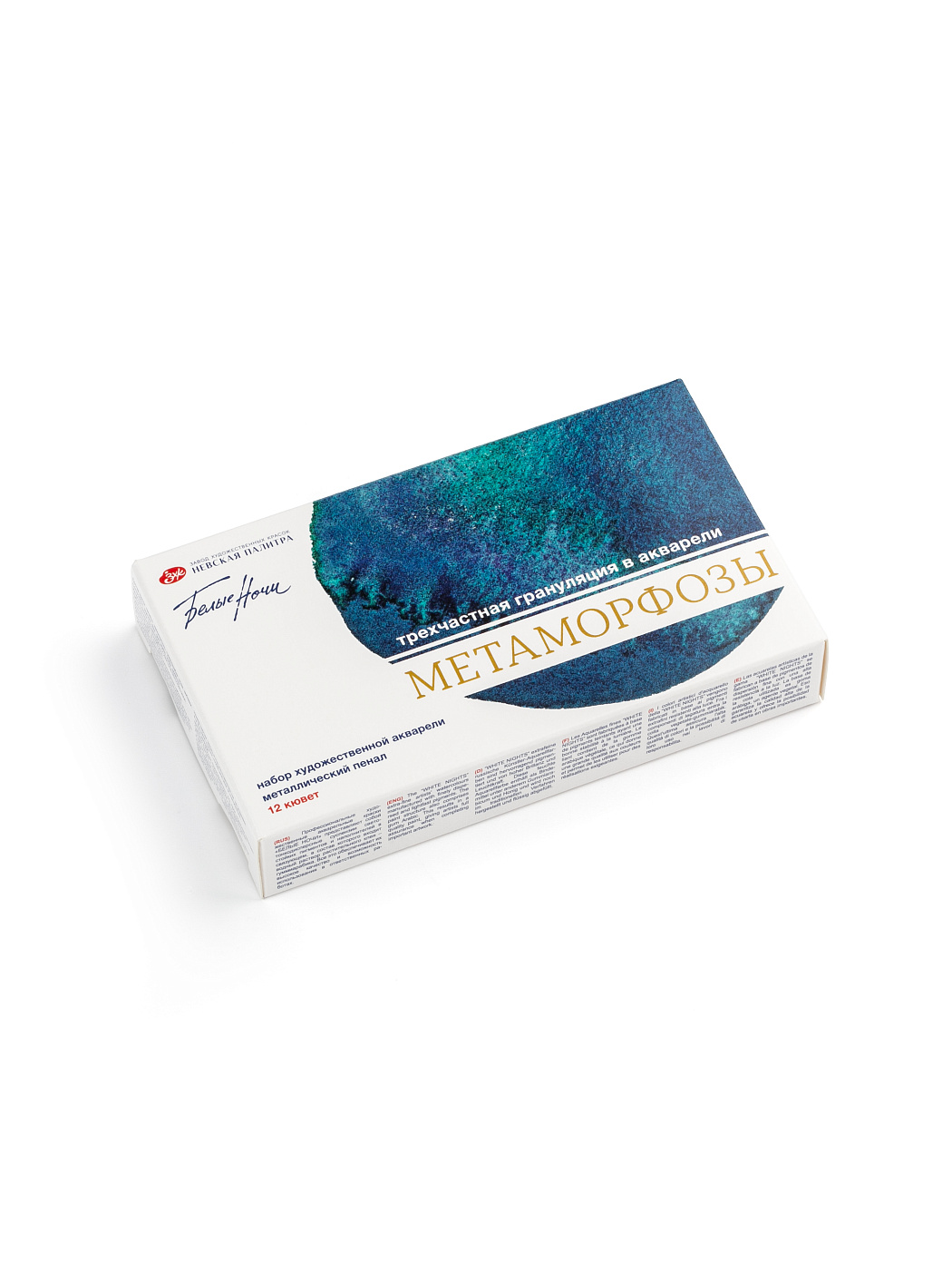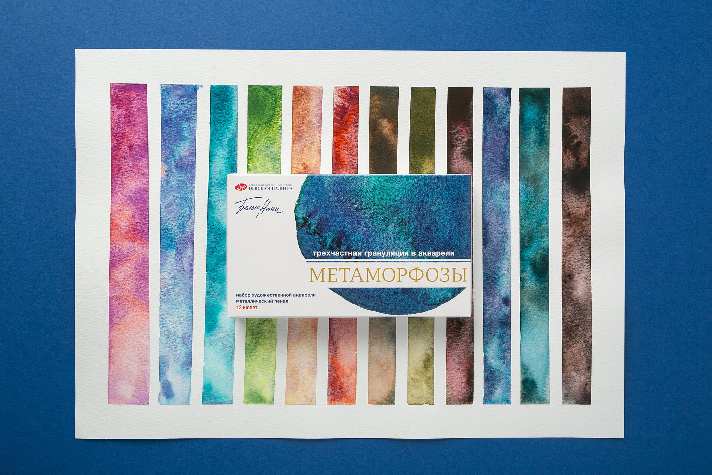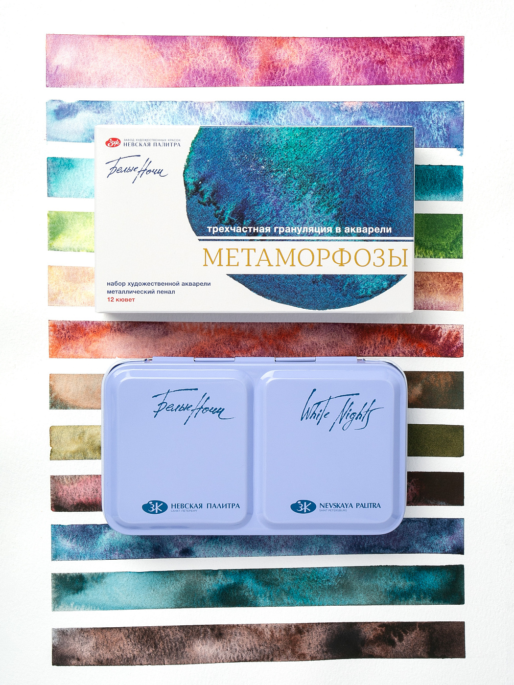 Набор акварели «Метаморфозы» - это коллекция из 12 оттенков трехчастной грануляции в акварели.