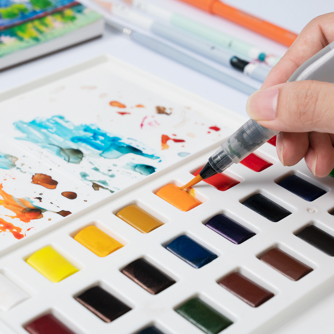 В наборе 36 цветов акварели в пластиковом пенале, кисть с резервуаром и 6 листов бумаги.