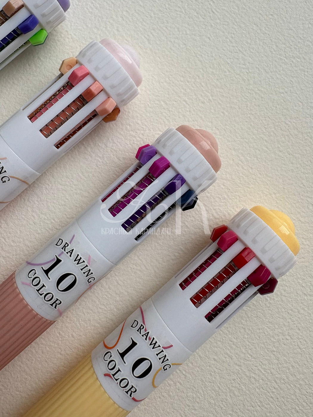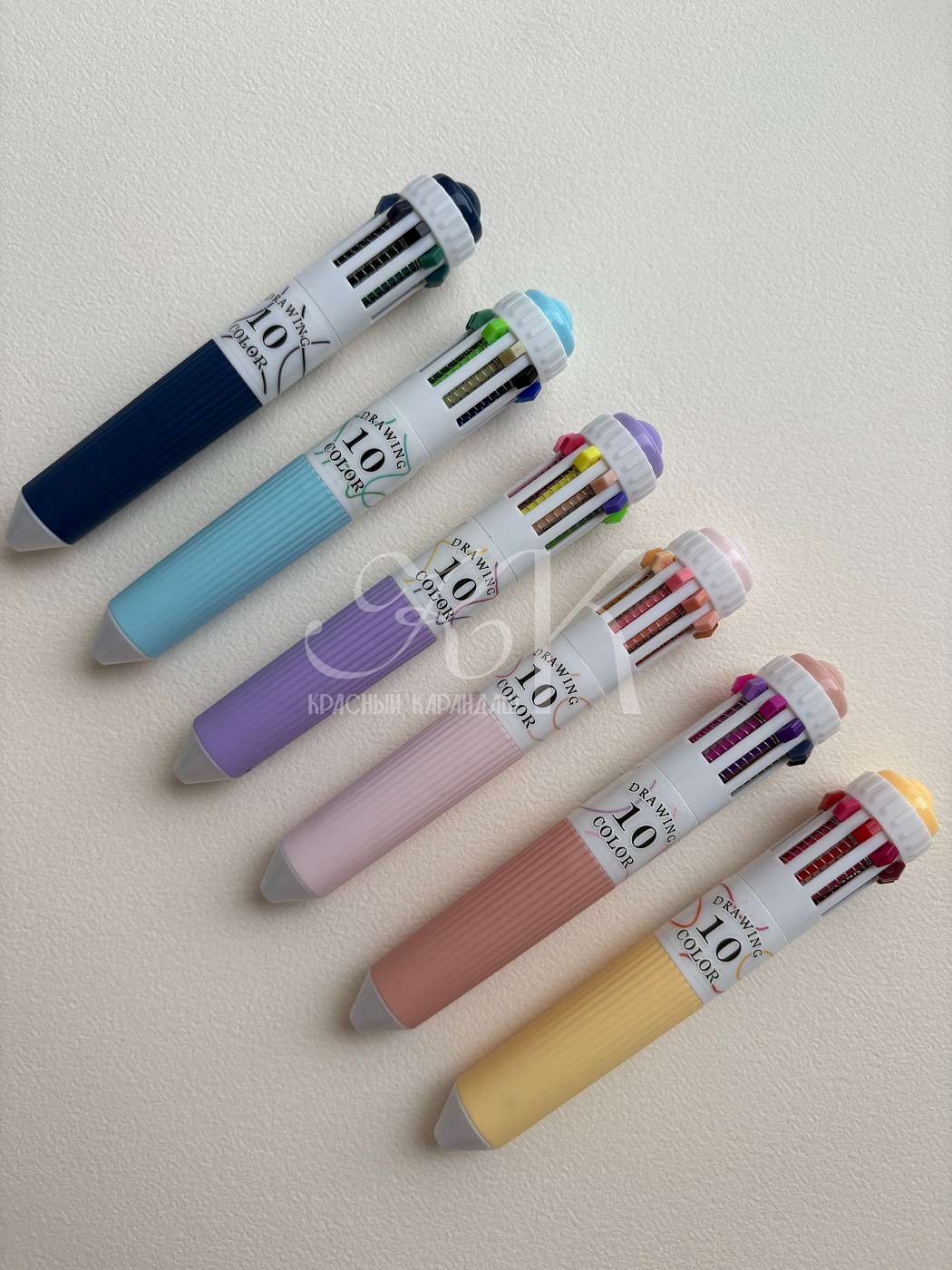В каждой ручке 10 шариковых стержней с разными оттенками. Толщина линии 0.8 мм.