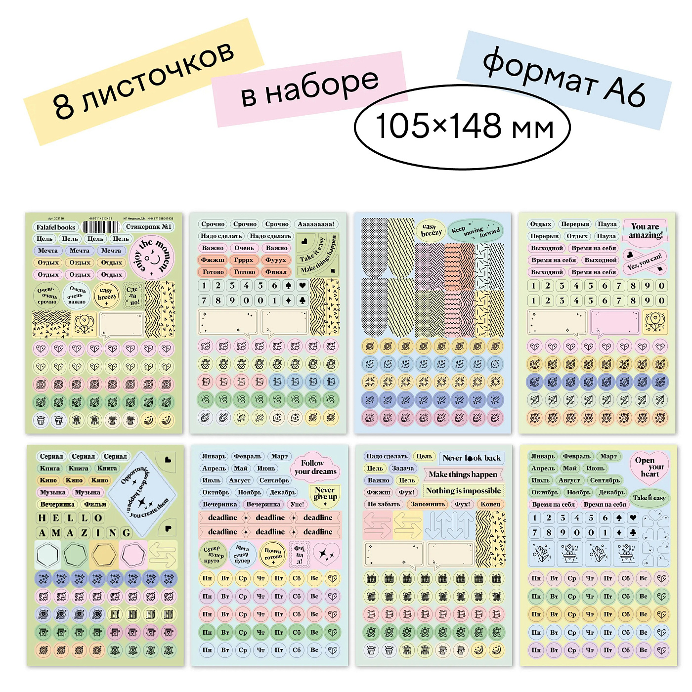 Мы очень ценим свободу во всём, особенно в организации собственных записей. Чтобы сделать этот процесс приятнее и удобнее, FALAFEL BOOKS выпустили серию наклеек для планеров и ежедневников. Стикерсет №1 поможет перенести на бумагу все дела и мечты, выделив самое главное, чтобы ничего не осталось без внимания.