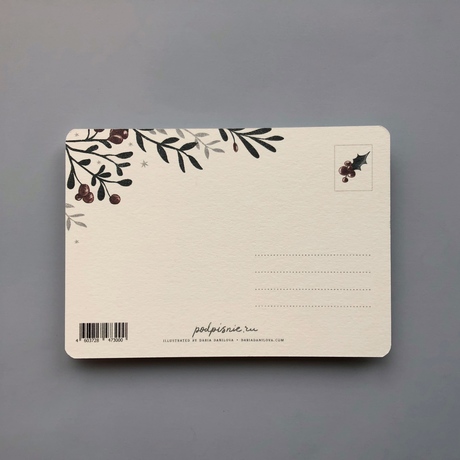 Чтобы поздравить родного человека или друга, не обязательно говорить слова, за вас это может сделать открытка. Открытка выполнена из дизайнерского картона цвета слоновой кости. На лицевой стороне оригинальный принт с новогодними мотивами, на обратной стороне вы можете написать адрес получателя, приклеить марку и написать самые теплые слова и пожелания.