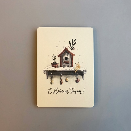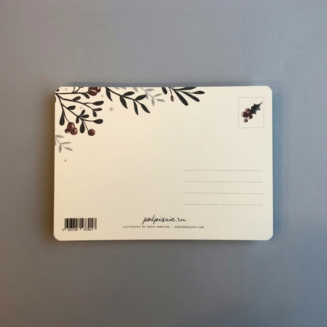Чтобы поздравить родного человека или друга, не обязательно говорить слова, за вас это может сделать открытка. Открытка выполнена из дизайнерского картона цвета слоновой кости. На лицевой стороне оригинальный принт с новогодними мотивами, на обратной стороне вы можете написать адрес получателя, приклеить марку и написать самые теплые слова и пожелания.