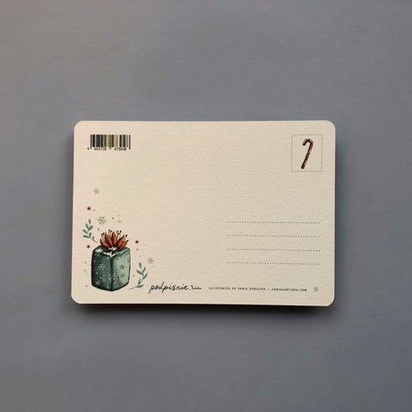 Чтобы поздравить родного человека или друга, не обязательно говорить слова, за вас это может сделать открытка. Открытка выполнена из дизайнерского картона цвета слоновой кости. На лицевой стороне оригинальный принт с новогодними мотивами, на обратной стороне вы можете написать адрес получателя, приклеить марку и написать самые теплые слова и пожелания.