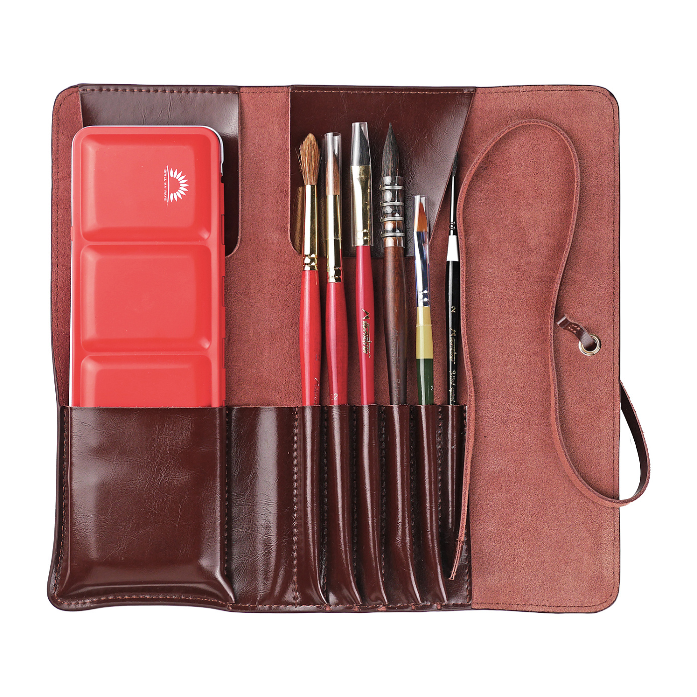 Пенал-скрутка Mairtini из натуральной кожи надёжно защитит кисти от повреждений. Внутри 6 отделений для кистей и одно больше, в которое можно поместить мини-набор акварели. Металлическая фурнитура и кожаный ремешок крепко фиксируют пенал в сложенном виде.