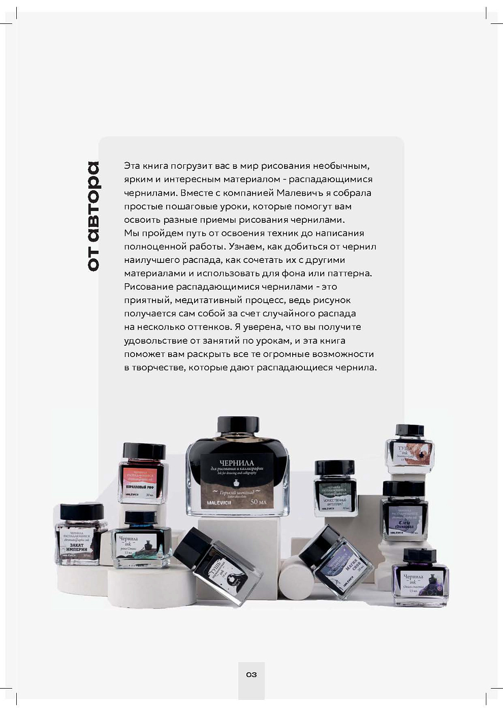 Это книга-знакомство с миром чернил. Компания Малевичъ совместно с талантливой художницей Лусине Сапонджян, художником-педагогом, выпускницей Школы акварели С.Н. Андрияки, выпускницей Художественно-Графического факультета МПГУ им. Ленина, руководителем творческой студии и участником выставок, издала данное пособие с простыми пошаговыми уроками, которые помогут освоить разные приемы рисования чернилами.