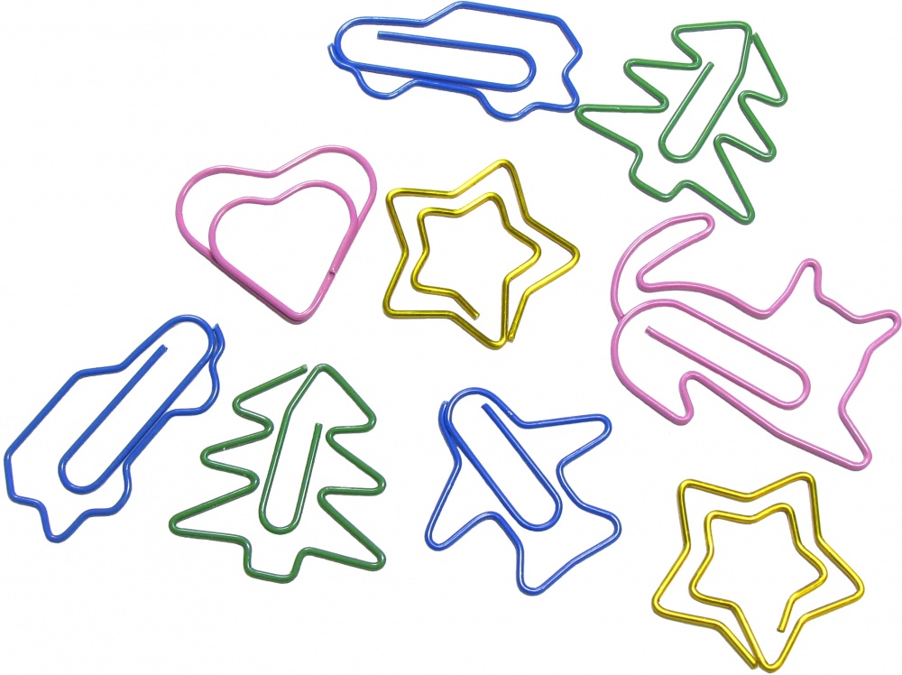 Фигурные канцелярские скрепки-ассорти. Длина 28-45 мм. Прочно скрепляют бумагу и не повреждают ее. В удобном пластиковом боксе 42 скрепки.