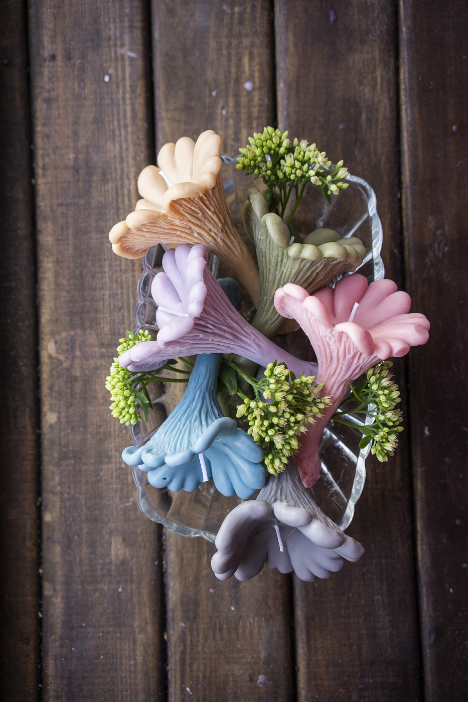 Интерьерная столовая Свеча "Гриб Лисичка" белого цвета с ароматом дымчатого уда.